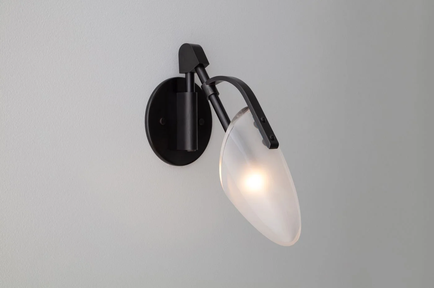 The Kinesis Sconce merges organically shaped blown glass with precisely engineered brass components. The smallest member of our modular lighting family is available in smoke, clear, or frosted glass, paired with an array of artisan metal patinas. Bring elegance to your project with this eye-catching accent.