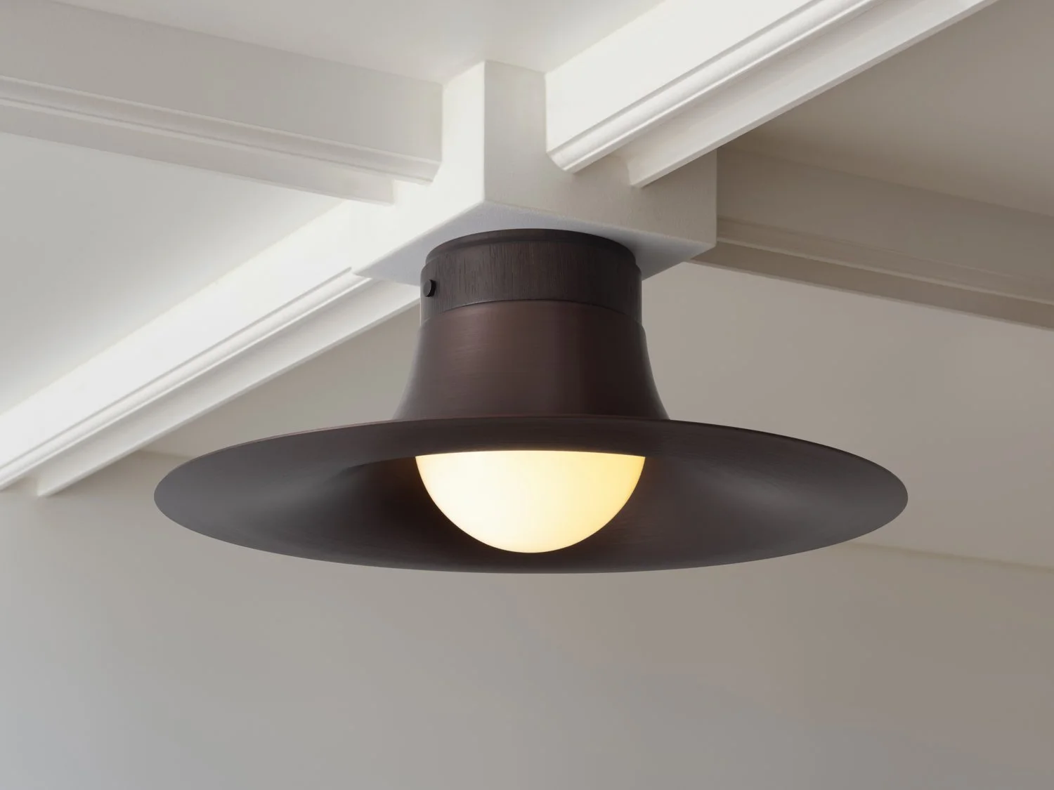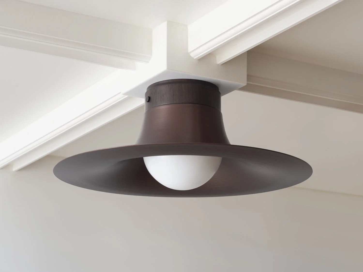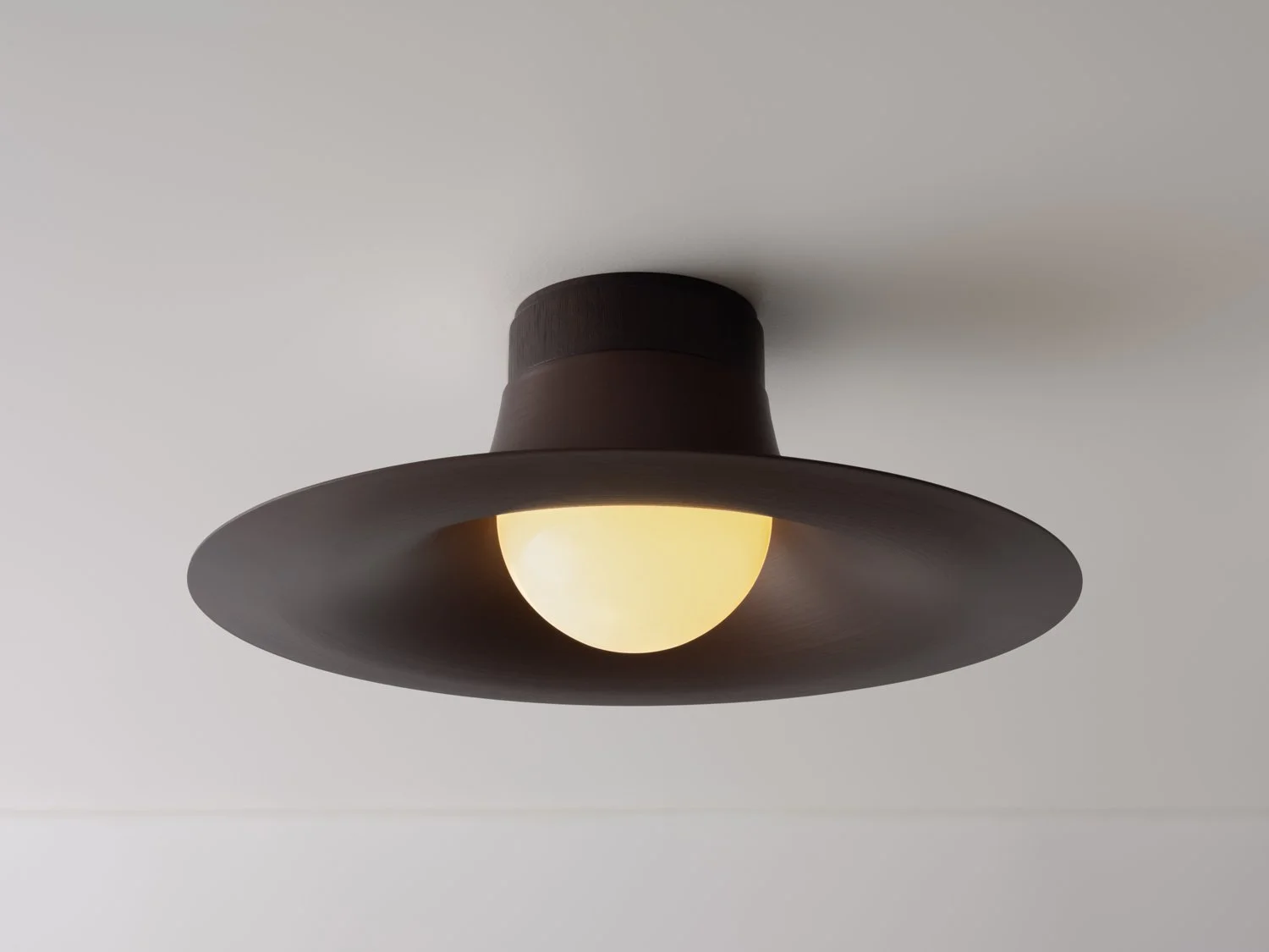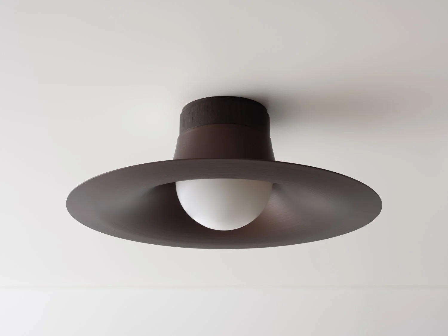 Translating the signature curvature of the Pommer Pendant and Floor Lamp into a compact, ceiling-mounted form. Thoughtful transitions between contrasting textural elements celebrate the rich materiality of spun metal and custom-finished hardwoods.