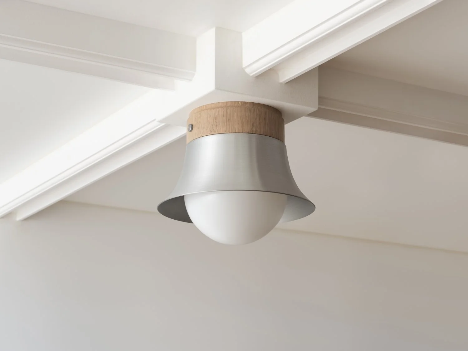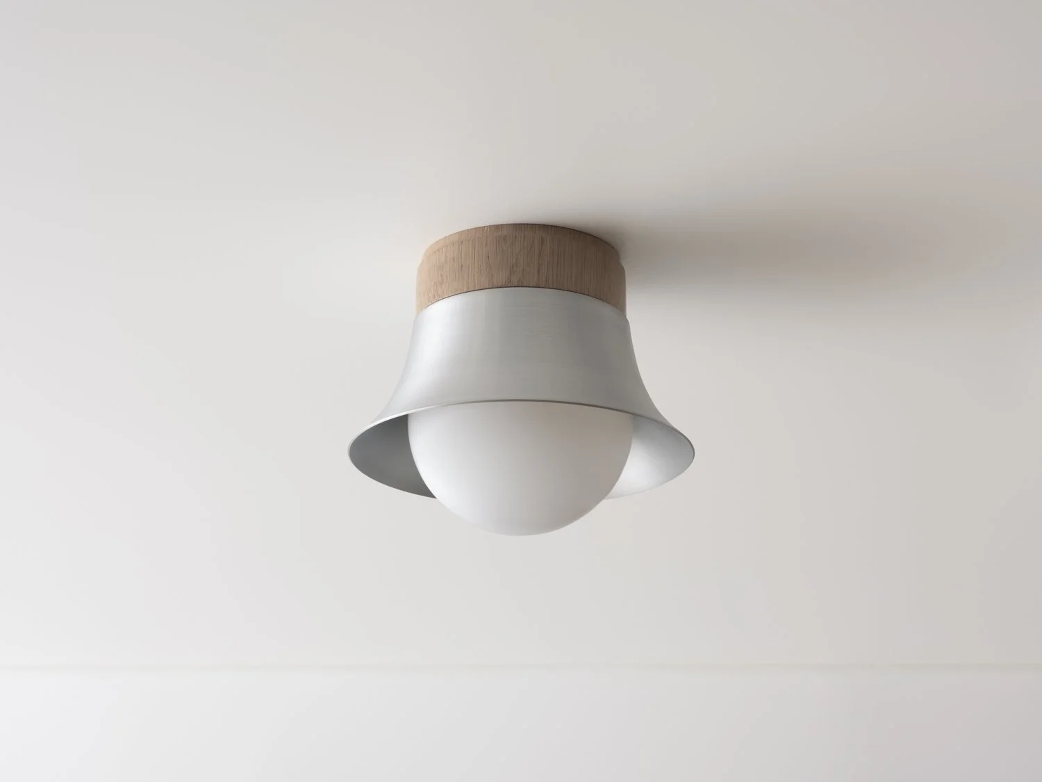 Translating the signature curvature of the Pommer Pendant and Floor Lamp into a compact, ceiling-mounted form. Thoughtful transitions between contrasting textural elements celebrate the rich materiality of spun metal and custom-finished hardwoods.